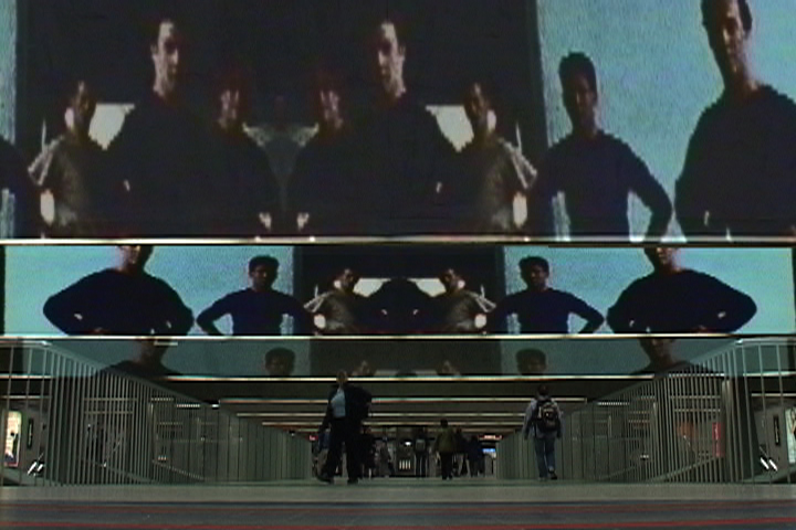 Espaces mouvants Soft Public Spaces réalisés par Irena Latek avec l’équipe de medialabAU en 2003 est une recherche-création sur le thème de l’architecture et du cinéma. Elle prend forme d’un projet des espaces publics conçus pour un festival du film à Montréal. Les interventions proposées sont des structures éphémères et installations audiovisuelles situées au centre-ville dans un secteur déstructuré et dans le métro. Critique de l’espace public métropolitain mis en forme par les grandes manifestations temporaires de la culture de masse, le projet cherche des formes « autres » du festival de film et infiltre l’événement dans la vie quotidienne des montréalais. Le travail explore l’interférence de l’image cinématographique avec un lieu urbain, le potentiel poétique et réceptive de l’installation. Le travail adopte l’image mouvante en tant qu’expression unique du projet d’espace. Ce mode de représentation en même temps sert à traduire le thème théorique de la recherche-création, architecture et cinéma, et à produire le narratif du projet d’espace public, finalement vise à affirmer le mouvement comme mode d’usage de l’espace et le principal aspect de la perception de celui-ci.La vidéo numérique combinée aux autres outils d’animations permet d’expérimenter la possibilité de « construire » espace en mouvement, et d’évoquer le sens des lieux affectés par une situation particulière. L’espace est celui que crée un corps en mouvement. La recherche tente ainsi de produire des outils de conception reflétant la complexité de l’espace et celle de la perception humaine. Dans cette expérimentation la spatialité d’image devient une architecture en soi. Parmi sept explorations, deux se déroulent exclusivement dans l’espace représenté. Le projet expérimente la technique de found foutage et développe la méthode du collage mouvant.