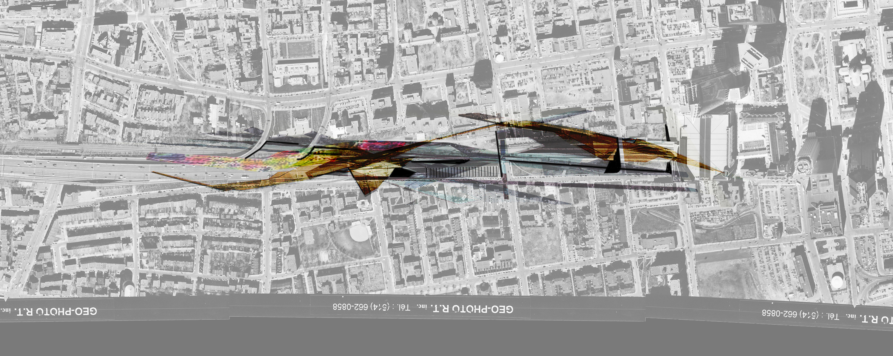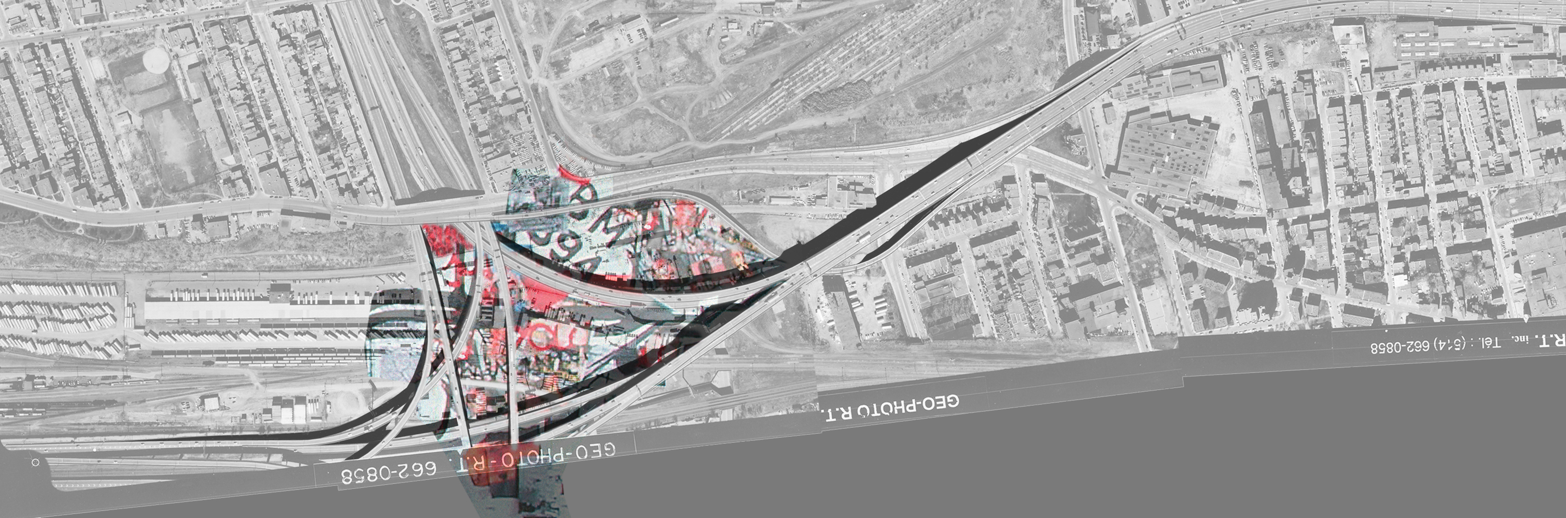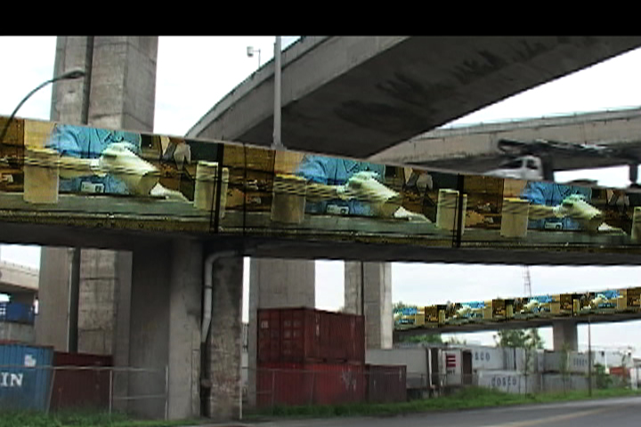 Ubiquités publiques Desynchronized Public Spaces s’installent sur l’autoroute urbaine. Le projet tente de combiner la dimension mondiale et la dimension locale de l’espace public, du même coup il rapproche la violence dans le monde à celle de l’autoroute. La recherche prend corp dans un réseau d’oeuvres. Chacune investit un site, à la fois particulier – l’entrée, passage, sortie de l’autoroute en ville – à la fois anonyme car générique et mobile. Chacune à sa manière conçoit le même objet hybride : le paysagemessage posé sur l’autoroute urbaine. Les narratifs des sept oeuvres, sept projets d’espace imaginé, se construisent au cours de déplacement, au fur et à mesure de la rencontre avec les lieux ; ils sont façonnés par l’esthétique de l’image télévisée et celle d’infrastructures routières en ville.
